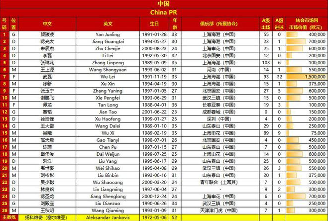 亚洲杯中国、卡塔尔26人大名单:武磊领衔,韦世豪在列